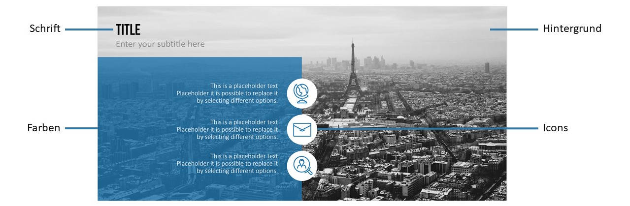 Auch weitere Designs wie Grafiken, Icons oder Bilder gehören dazu. Mit diesen zusätzlich genutzten Elementen können Ihre Präsentation und Ihre Kernaussagen weiter untermauert sowie Ihr Publikum optisch angesprochen werden. Langweilige Textblöcke waren gestern, spannende Design Elemente sind heute Pflicht für eine gute Präsentation!